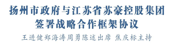 10月24日,揚(yáng)州市人民政府與江蘇省蘇豪控股集團(tuán)有限公司簽署戰(zhàn)略合作框架協(xié)議。市委書記王進(jìn)健,市委副書記、市長鄭海濤,蘇豪控股集團(tuán)董事長周勇、總裁陳述出席協(xié)議簽約儀式。市委副書記、秘書長焦慶標(biāo)主持儀式。