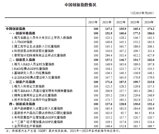 根據(jù)國家統(tǒng)計局社科文司《中國創(chuàng)新指數(shù)研究》課題組測算,2024年中國創(chuàng)新指數(shù)為174.2(以2015年為100),比上年增長5.3%[1]。分領域看,創(chuàng)新環(huán)境指數(shù)、創(chuàng)新投入指數(shù)、創(chuàng)新產(chǎn)出指數(shù)和創(chuàng)新成效指數(shù)分別為186.0、162.6、215.8和132.4,分別比上年增長4.9%、5.1%、8.1%和1.9%。結(jié)果表明,2024年中國創(chuàng)新指數(shù)保持穩(wěn)步增長,我國科技創(chuàng)新能力持續(xù)提升,創(chuàng)新產(chǎn)出較快增長,發(fā)展新動能不斷壯大,為經(jīng)濟高質(zhì)量發(fā)展提供有力支撐。