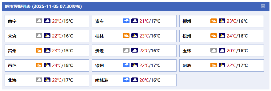 今天(5日)清晨,全區(qū)大部陰天到多云為主,桂南局地仍有小雨灑落,08時全區(qū)大部氣溫在13~17℃,體感還是比較寒涼。
