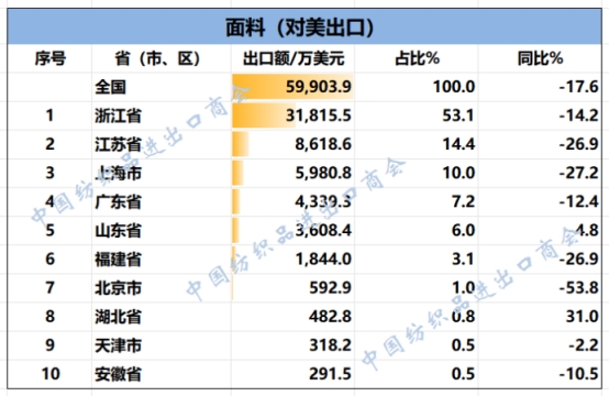 2025年1-9月,我國紡織服裝累計對美出口339.57億美元,同比下降10.1%。浙江省、江蘇省、廣東省、山東省、上海分別列全國紡織服裝對美出口省市前五位,合計比重超八成。