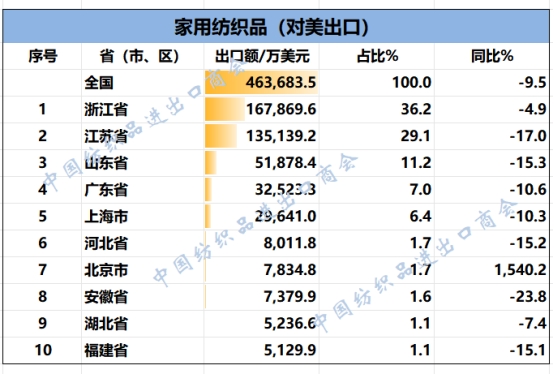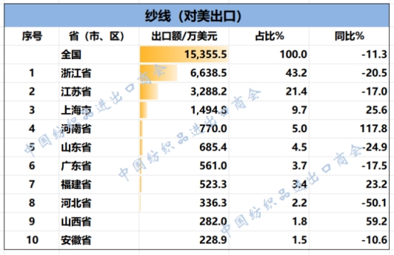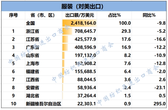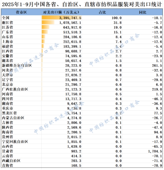 2025年1-9月,紡織服裝類重點商品對美出口前十名的省(市、區(qū))
