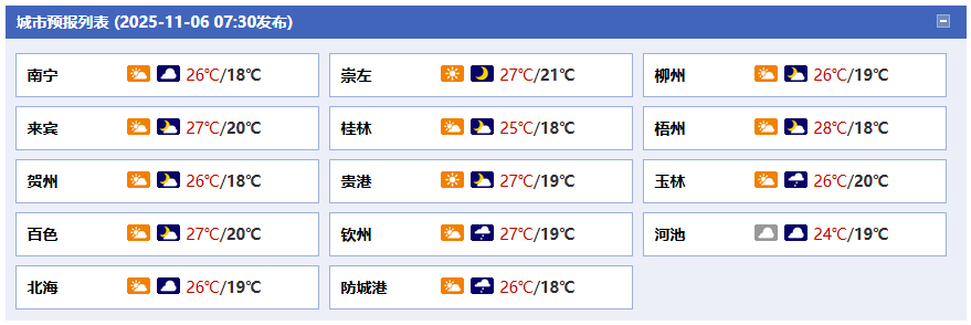 11月6日白天到晚上,全區(qū)整體以陰天到多云為主,其中百色、河池、崇左、防城港等市陰天伴有分散小雨。值得關(guān)注的是,11月7日至8日,受臺風(fēng) “海鷗” 外圍偏東氣流與冷空氣交匯影響,廣西將迎來新一輪降雨。具體來看,11月7日,桂北、桂西地區(qū)將出現(xiàn)中雨,局部可能會有大雨或暴雨;全區(qū)其他地區(qū)以陰天有小雨為主,局部也可能出現(xiàn)大雨。同時,沿海地區(qū)還將出現(xiàn)6~7 級陣風(fēng),沿海居民需警惕陣風(fēng)對戶外設(shè)施及出行安全的影響。