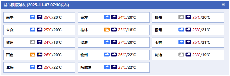 南寧市:今天白天陰天有小雨,今天晚上有小到中雨,偏東風(fēng)2級,最高氣溫25℃,最低氣溫21℃。