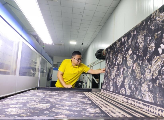 在忻城繭絲綢產(chǎn)業(yè)園印花廠內(nèi),數(shù)碼印花機正在進行絲綢數(shù)碼噴印