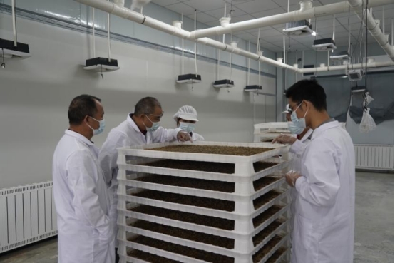 工作人員正在小蠶共育室觀察小蠶生長情況