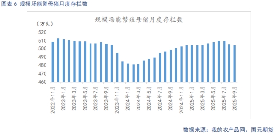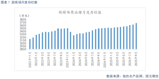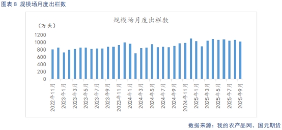 據(jù)Mysteel統(tǒng)計(jì),截至2025年9月底,樣本規(guī)模場能繁母豬存欄量為504.21萬頭,環(huán)比下降0.28%,同比增長1.09%。8-9月傳統(tǒng)需求旺季,豬價(jià)卻持續(xù)低迷,加之政策引導(dǎo)下的產(chǎn)能調(diào)控,規(guī)模場開始優(yōu)化產(chǎn)能,低效母豬淘汰加速,規(guī)模場能繁母豬存欄開始小幅下降。但從生產(chǎn)周期推算,2025年規(guī)模場理論產(chǎn)能仍呈現(xiàn)環(huán)比上升態(tài)勢,產(chǎn)能調(diào)控若順利推進(jìn),實(shí)際兌現(xiàn)效果也要等到26年二季度后,后續(xù)也要持續(xù)觀察產(chǎn)能調(diào)控的持續(xù)性。樣本規(guī)模場9月商品豬存欄數(shù)為3684.99萬頭,環(huán)比增加1.44%,同比增加5.29%。樣本規(guī)模場9月商品豬出欄量為1021.73萬頭,環(huán)比減少4.54%,同比增加23.49%。9月中小散認(rèn)賣意愿較強(qiáng),市場豬源充足,加之需求提振力度有限,部分規(guī)模場出欄計(jì)劃未能完成。10月上旬,規(guī)模場加速出欄,供給集中釋放,豬價(jià)持續(xù)低迷。至10月下旬,挺價(jià)情緒升溫,出欄節(jié)奏放緩。供給過剩情況未根本性扭轉(zhuǎn),而壓欄導(dǎo)致部分供給后置,近期豬價(jià)回暖后,養(yǎng)殖端認(rèn)賣情緒升溫,二育因補(bǔ)欄成本增大,入場積極性下降,出欄節(jié)奏逐步恢復(fù),供給延續(xù)寬松預(yù)期。