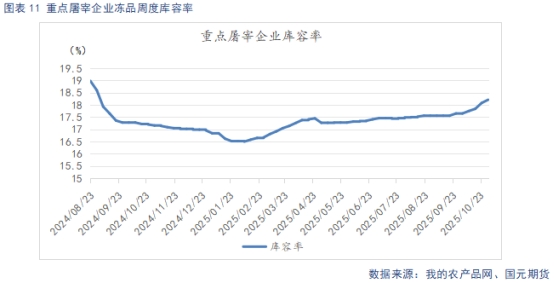 截至11月12日,重點(diǎn)屠宰企業(yè)開工率為33.95%,較上周環(huán)比回升0.42%。冷凍肉庫容率18.23%,較上周環(huán)比上升0.02%。氣溫轉(zhuǎn)涼后,居民肉類消費(fèi)有所回升。不過年關(guān)較晚,腌臘、年底備貨集中啟動(dòng)推遲,當(dāng)前需求仍顯偏淡。凍庫庫存方面,凍肉走貨緩慢,且豬價(jià)仍處低位,存在被動(dòng)入庫的現(xiàn)象,凍品去庫緩慢。需要注意的是,豬價(jià)低迷時(shí),屠企低價(jià)分割入庫,一定程度上緩解市場供應(yīng)壓力,在下方支撐豬價(jià)。但豬價(jià)回暖,低價(jià)凍品投放市場,將對(duì)鮮肉消費(fèi)造成一定沖擊,抑制豬價(jià)上方空間。