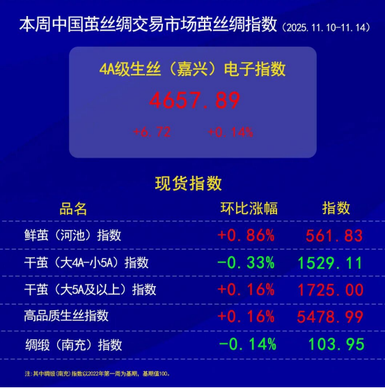 干繭價(jià)格指數(shù)方面,仍由全國鮮繭收烘與干繭貿(mào)易數(shù)據(jù)綜合構(gòu)成。其中,大 4A 至小5A干繭價(jià)格指數(shù)環(huán)比上周有所下滑,而大 5A 及以上干繭價(jià)格指數(shù)環(huán)比有所收紅,反映市場對高品質(zhì)干繭的需求仍相對穩(wěn)健。