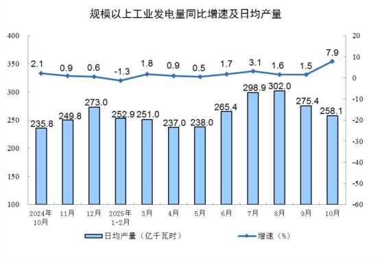 分產(chǎn)品看,10月份,規(guī)模以上工業(yè)623種產(chǎn)品中有313種產(chǎn)品產(chǎn)量同比增長。其中,鋼材11864萬噸,同比下降0.9%;水泥14775萬噸,下降15.8%;十種有色金屬695萬噸,增長2.9%;乙烯314萬噸,增長11.7%;汽車327.9萬輛,增長11.2%,其中新能源汽車171.0萬輛,增長19.3%;發(fā)電量8002億千瓦時,增長7.9%;原油加工量6343萬噸,增長6.4%。