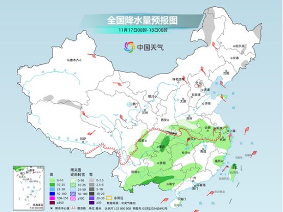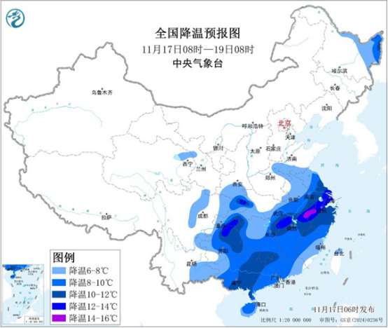 今明兩天(11月17日至18日),寒潮繼續(xù)給我國(guó)中東部帶來(lái)大風(fēng)、降溫天氣,氣溫將自北向南陸續(xù)跌入低谷,并且會(huì)大面積創(chuàng)下半年來(lái)新低。與此同時(shí),寒潮帶來(lái)的降雪今天將逐漸減弱結(jié)束,南方陰雨有所增多,明天起全國(guó)大部將轉(zhuǎn)為晴朗干燥的天氣格局。