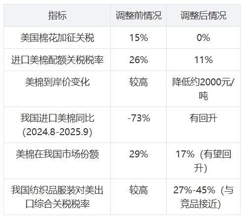 就在出口數(shù)據(jù)公布之際,中美經(jīng)貿(mào)合作傳來重磅利好,為紡織行業(yè)注入強(qiáng)心劑。根據(jù)國務(wù)院關(guān)稅稅則委員會(huì)11月5日公告,自2025年11月10日起,我國停止對(duì)原產(chǎn)于美國的棉花加征15%關(guān)稅,進(jìn)口美棉配額關(guān)稅稅率由26%降至11%。美方同步落地配套政策,將對(duì)華“芬太尼關(guān)稅”下調(diào)10%,并將24%的對(duì)華關(guān)稅暫停期延長至2026年11月。