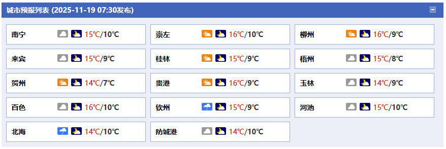 20日白天到21日晚上,全區(qū)晴到少云,桂北局地有霜凍。最低氣溫:高寒山區(qū)-4~4℃,桂北5~10℃,桂南10~12℃。