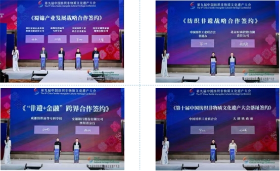 現(xiàn)場,中國紡織工業(yè)聯(lián)合會非遺辦與成都紡織高等??茖W(xué)校、四川富潤企業(yè)重組投資有限責(zé)任公司、四川安娜凱瑟莉服飾有限公司共同舉行“蜀錦產(chǎn)業(yè)發(fā)展戰(zhàn)略合作簽約”;中國紡聯(lián)非遺辦與北京時尚控股有限責(zé)任公司進行“紡織非遺戰(zhàn)略合作簽約”;交通銀行成都東部新區(qū)支行與成都紡織高等??茖W(xué)校進行“‘非遺+金融’跨界合作簽約”;值得一提的是,大會將于2026年迎來第十屆,現(xiàn)場舉行了中國紡織工業(yè)聯(lián)合會與東莞市大朗鎮(zhèn)“第十屆中國紡織非物質(zhì)文化遺產(chǎn)大會落址簽約”,將傳承的火炬繼續(xù)傳遞。一系列的簽約匯聚了國家級行業(yè)組織、專業(yè)高等院校、地方政府、金融機構(gòu)和實力企業(yè),標志著紡織非遺從技藝研究、產(chǎn)品開發(fā)到市場應(yīng)用的完整產(chǎn)業(yè)鏈條被成功打通,為非遺新生注入了強勁動能。