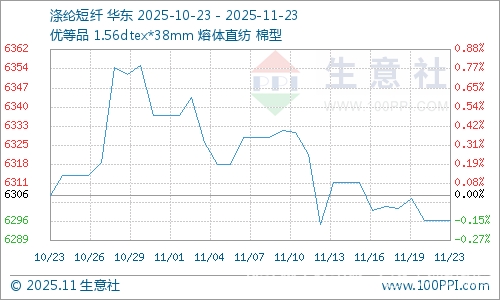 據(jù)生意社商品行情分析系統(tǒng),本周(11月17-23日)國內(nèi)滌綸短纖價格震蕩下跌,截止11月23日滌綸短纖(1.4D*38mm)市場均價在6297元/噸,較周初下跌0.06%。