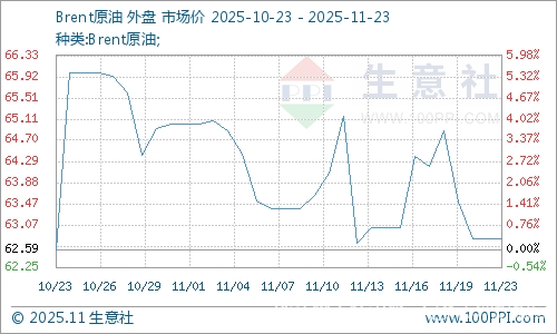 后市來看,原油市場供應過剩大勢下油價重心有自然下行驅(qū)動,但地緣因素不斷給市場注入不確定性,并在一定程度上對沖供應過剩的下行壓力,油價維持震蕩反復的運行節(jié)奏,短期仍將繼續(xù)保持高波動特征。截止11月20日,美國WTI原油期貨1月合約結(jié)算價報59.00美元/桶,布倫特原油期貨2月合約結(jié)算價報62.80美元/桶。