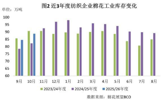 新棉大量上市,市場上可選資源增多,有補庫需求的紡紗企業(yè)開始采購,原料庫存有所上升。截至10月底紡織企業(yè)在庫棉花工業(yè)庫存量為88.8萬噸,較上月底增加4.3萬噸。紡織企業(yè)可支配棉花庫存量為106.7萬噸,較上月底增加3.4萬噸。其中:38%的企業(yè)增加棉花庫存,16%減少,46%基本保持不變。盡管新棉供應(yīng)充足,但隨著下游即將進入傳統(tǒng)淡季,企業(yè)補庫的持續(xù)性仍需觀察。