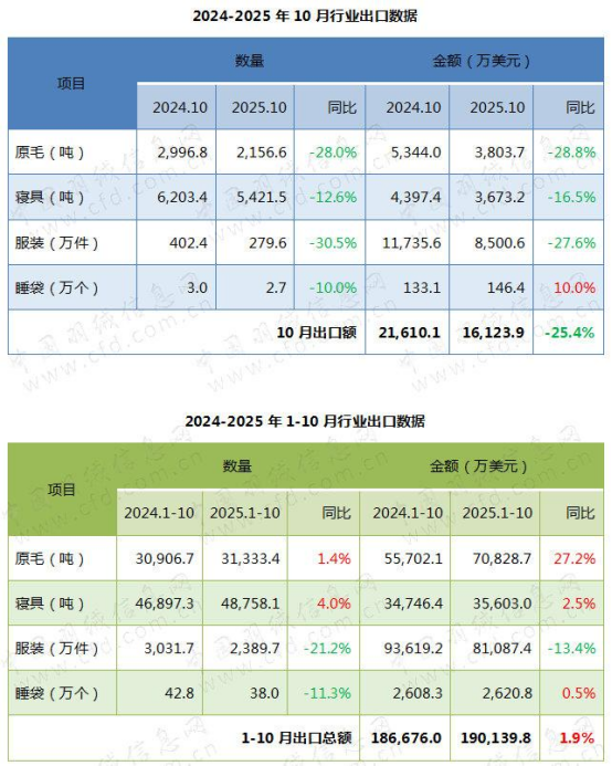 2025年10月,我國羽絨行業(yè)出口額約1.6億美元,同比下降25.4%,創(chuàng)今年以來最大跌幅,出口額連續(xù)四個月處于下跌狀態(tài)。原毛、服裝、寢具出口數(shù)量和金額同比均有較大跌幅,出口額分別下跌28.8%、27.6%和16.5%。
