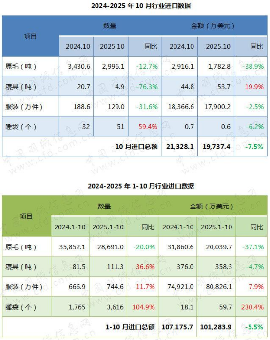 綜合1-10月,行業(yè)進口總額約10.1億美元,同比下降5.5%。其中,原毛進口量值齊跌,服裝進口量值均有所上漲。