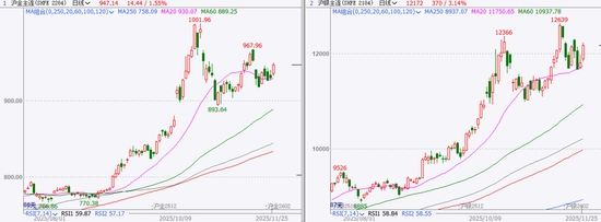11月25日周二,受到美聯(lián)儲12月降息預(yù)期升溫的提振,國內(nèi)貴金屬價格延續(xù)隔夜的漲勢進一步走強,滬金主力合約一度漲1.8%,滬銀主力合約漲幅超3.5%,但午后價格上行動力減弱漲幅收窄,AU2602收于946.5元/克,漲幅1.48%,AG2602收于12127元/千克,漲幅2.75%。