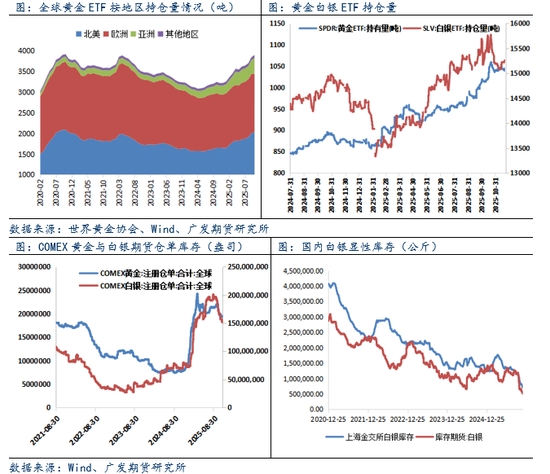 10月以來貴金屬價格沖高回落仍保持高位震蕩,在此情況下實物投資需求保持偏強,全球黃金ETF持倉整體維持凈流入,共增持55.4噸連續(xù)5個月增加,其中北美地區(qū)流入規(guī)模最大達到47噸,其次為亞洲增持約45噸,但歐洲地區(qū)出現(xiàn)凈流出37.4噸,美聯(lián)儲寬松貨幣政策疊加美國政府關(guān)門等影響下機構(gòu)投資者增持黃金ETF意愿仍較強。目前截至11月24日,全球最大 SPRD黃金ETF基金持倉為1040.9噸,總體保持在3年多高位。而全球最大SLV白銀(52.00, 0.37, 0.72%)ETF基金持倉在24日單日大幅增加253.9噸為近1個多月來最大增持規(guī)模,反映資金通過ETF增持白銀的意愿較強。強勁的投資需求進一步影響庫存供應(yīng),10月以來紐約和上海市場庫存持續(xù)降低,COMEX黃金倉單庫存累計減少月280萬盎司,白銀庫存減少4194萬盎司,上海金交所和上期所兩市白銀庫存則將至10年新低。與此同時,我國10月未鍛造白銀出口大幅飆升至654噸創(chuàng)2007年6月以來最高水平,環(huán)比升23%,同比升77%,在庫存趨緊的情況下中國商務(wù)部在10月末公布了《2026—2027年度鎢、銻、白銀出口國營貿(mào)易企業(yè)申報條件及申報程序》,旨在加強對白銀等金屬的出口管制。供應(yīng)緊張情緒升溫還反應(yīng)到價格上,近期倫敦金銀現(xiàn)貨價格屢次出現(xiàn)對COMEX期貨價格的升水。