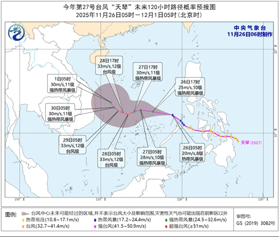 此外,海上還需關(guān)注今年第27號臺風“天琴”。它已于今天凌晨移入南海,預(yù)計,“天琴”將以每小時20至25公里的速度向偏西方向移動,強度逐漸加強,最強可達臺風級,29日開始逐漸轉(zhuǎn)向西偏北方向移動,向南海中西部海面靠近,強度緩慢減弱。