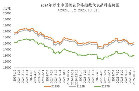 10月國(guó)內(nèi)棉價(jià)先抑后揚(yáng)。上旬新棉上市,疊加豐產(chǎn)及需求不旺,棉價(jià)延續(xù)上月底跌勢(shì);月中下旬受“十五五”規(guī)劃建議明確擴(kuò)大內(nèi)需提振消費(fèi)等政策、中美經(jīng)貿(mào)磋商達(dá)成共識(shí)等因素提振國(guó)內(nèi)棉價(jià)反彈;月末中國(guó)棉花價(jià)格指數(shù)(CCIndex3128B)以當(dāng)月最高點(diǎn)報(bào)收。國(guó)際棉價(jià)同步呈先跌后反彈走勢(shì),主要受美聯(lián)儲(chǔ)再次降息、中美磋商積極信號(hào)、美國(guó)政府持續(xù)停擺等綜合因素影響。