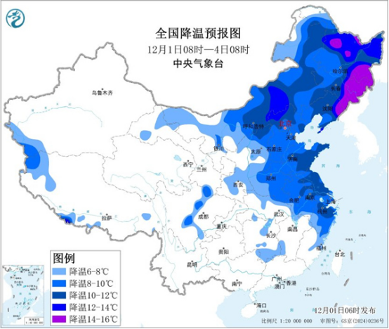 未來三天,寒潮繼續(xù)東移南下,并有冷空氣補(bǔ)充影響,我國大部降溫明顯。中央氣象臺今晨繼續(xù)發(fā)布寒潮藍(lán)色預(yù)警,預(yù)計,江南東北部及長江以北地區(qū)日平均或最低氣溫普遍下降6至10℃,內(nèi)蒙古中東部、華北北部、東北地區(qū)、黃淮東部、江淮東部等地下降10至12℃,局地降溫可達(dá)14至16℃。12月4日早晨,最低溫度0℃線將南壓至浙江中部、安徽南部、湖北北部一帶。