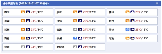 南寧市:今天白天到晚上,多云,偏北風(fēng)1~2級,最高氣溫24℃,最低氣溫17℃。