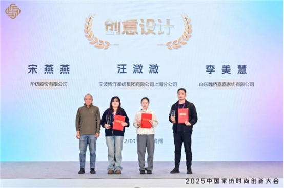 競賽副總裁判長、江南大學(xué)教授、博士生導(dǎo)師、高級家紡設(shè)計師張毅為“創(chuàng)意設(shè)計”單項獎第一名寧波博洋家紡集團有限公司上海分公司汪溦溦、第二名山東魏橋嘉嘉家紡有限公司李美慧、并列第二名華紡股份有限公司宋燕燕頒獎。
