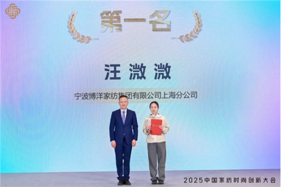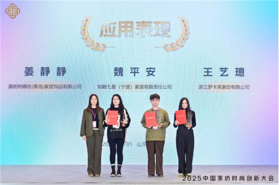 中國家用紡織品行業(yè)協(xié)會副會長吳永茜為“應(yīng)用表現(xiàn)”單項獎第一名知眠七星(寧波)家居有限責(zé)任公司魏平安、第二名浙江羅卡芙家紡有限公司王藝璁、第三名鑫帕特娜絲(青島)家居飾品有限公司姜靜靜頒獎。