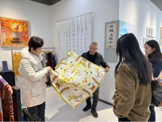 在淄博大染坊絲綢集團(tuán)有限公司,實(shí)地參觀了生產(chǎn)車間、絲綢主題文化展廳。作為全國(guó)制造業(yè)單項(xiàng)冠軍示范企業(yè),大染坊擁有從繅絲、織造到練染印的完整產(chǎn)業(yè)鏈,其絲綢面料織造產(chǎn)量穩(wěn)居全國(guó)首位。企業(yè)將傳統(tǒng)絲織技法融入現(xiàn)代生產(chǎn)工藝,創(chuàng)新研發(fā)的國(guó)潮國(guó)風(fēng)絲巾等系列手造產(chǎn)品,暢銷全球50多個(gè)國(guó)家地區(qū)。