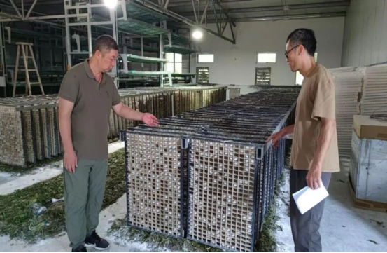 農(nóng)業(yè)專家現(xiàn)場(chǎng)查看325孔方格蔟結(jié)繭情況