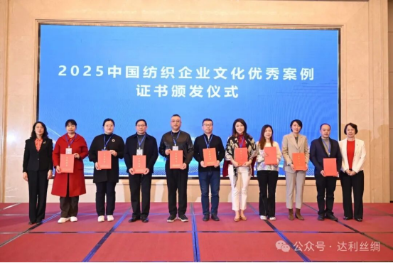 近日,以 “育文化強(qiáng)基 啟紡織未來” 為主題的 2025 中國(guó)紡織企業(yè)文化大會(huì)在江西南昌舉行,達(dá)利絲綢憑借《織夢(mèng)絲路 —— 達(dá)利絲綢全產(chǎn)業(yè)鏈可持續(xù)發(fā)展與社會(huì)責(zé)任實(shí)踐案例》,憑借 “文化 + AI + 綠色” 的創(chuàng)新融合模式,獲評(píng) “2025 中國(guó)紡織企業(yè)文化優(yōu)秀案例”,獲行業(yè)高度認(rèn)可。