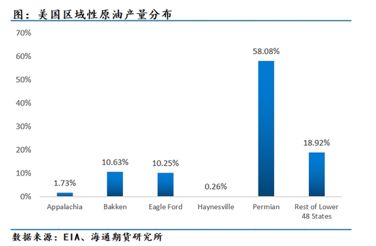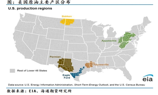 對(duì)于整體產(chǎn)量更為直觀的是原油價(jià)格對(duì)于原油邊際成本的影響,美國(guó)頁(yè)巖油主要產(chǎn)區(qū)根據(jù)EIA的劃分,可共分為五大產(chǎn)區(qū)分別是二疊紀(jì)(Permian)、貝肯(Bakken)、鷹伏特(Eagle Ford)、阿巴拉契亞(Appalachia)以及海恩斯維爾(Haynesville)。
