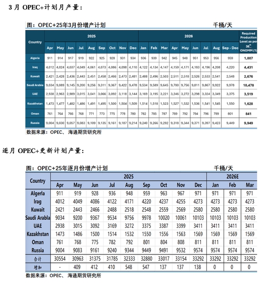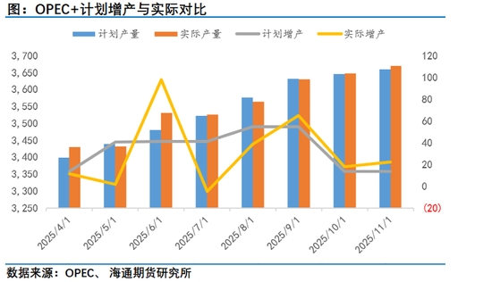 OPEC 在從2025年3月份OPEC+會(huì)議公布后,其計(jì)劃開(kāi)始從4月起每個(gè)月開(kāi)始回補(bǔ)之前減產(chǎn)額度,回補(bǔ)期間為2025年4月至2026年9月,但我們結(jié)合實(shí)際來(lái)看,OPEC+在2025年9月前加上阿聯(lián)酋必要增產(chǎn)30萬(wàn)桶/天,實(shí)則在回補(bǔ)計(jì)劃層面就已經(jīng)滿足了原本在26年9月才會(huì)最終結(jié)束的聯(lián)合減產(chǎn)回補(bǔ)計(jì)劃。 如果我們從產(chǎn)量規(guī)劃的角度來(lái)看,也可以看出在OPEC+3月份給予最初的產(chǎn)量規(guī)劃,和我們統(tǒng)計(jì)下來(lái)每個(gè)月調(diào)整的產(chǎn)量規(guī)劃也有出入。