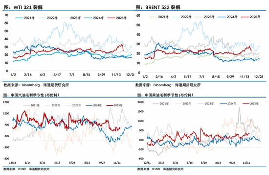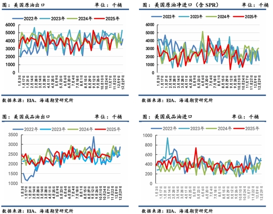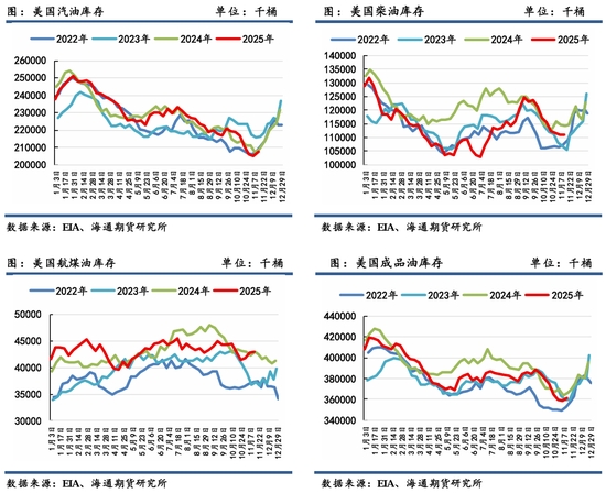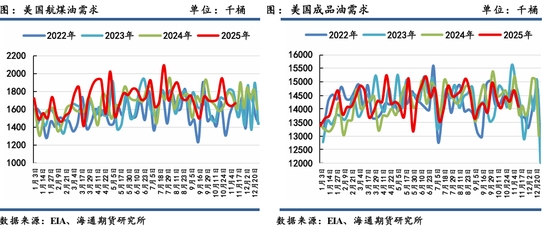 美國(guó)是全球最大的成品油消費(fèi)大國(guó),其消費(fèi)高峰一般聚集在將士陣亡日期間的暑假出行帶動(dòng)。據(jù)EIA 數(shù)據(jù)顯示,截止11月14日,2025全年美國(guó)汽油、柴油、航空煤油平均需求分別為878、380、171 萬(wàn)桶/天,同比變化+0.9%、+0.2%、+3.6%,消費(fèi)增量主要來(lái)源于航煤需求,汽柴需求量相對(duì)穩(wěn)健。整體來(lái)看,美國(guó)自身成品油需求仍具有韌性,也即對(duì)應(yīng)煉廠要維持相對(duì)高開(kāi)工率以滿足國(guó)內(nèi)油品需求。