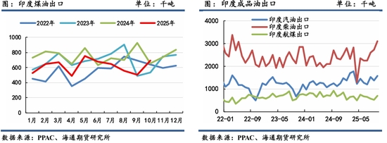 印度是原油進(jìn)口國(guó)和成品油凈出口國(guó)。原油進(jìn)口方面,超80%的原油進(jìn)口來(lái)自中東和俄羅斯。今年1-10 月份,累計(jì)進(jìn)口原油2.06億噸,較去年同期2.01億噸增加。不過(guò)今年8月份以來(lái),由于歐美加強(qiáng)制裁俄羅斯石油出口,且特朗普表示因印度采買俄油行為而對(duì)印度加征50%的關(guān)稅,迫于關(guān)稅壓力下,印度自俄羅斯進(jìn)口原油更為謹(jǐn)慎,轉(zhuǎn)而向中東市場(chǎng)進(jìn)行填補(bǔ),包括印度最大的煉油商信實(shí)工業(yè)也據(jù)悉將停購(gòu)俄石油。