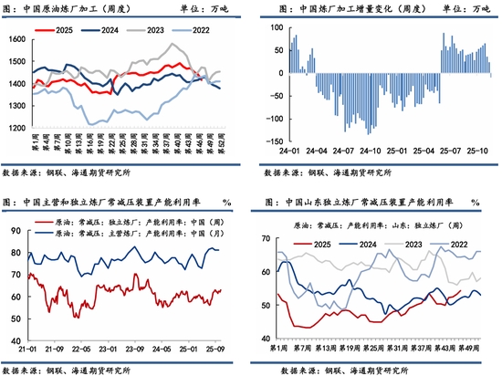 總量上來(lái)看,2025年1-11 月中國(guó)主營(yíng)和獨(dú)立煉廠累計(jì)加工6.8億噸,同比增長(zhǎng)0.07%,基本持平于去年。常減壓下主營(yíng)煉廠維穩(wěn)在70-80%附近的開(kāi)工率,地?zé)掗_(kāi)工率則保持在55%-60%之間,且相對(duì)過(guò)往年份來(lái)看其開(kāi)工季節(jié)性下降明顯,這也受國(guó)內(nèi)終端消費(fèi)不足與煉油毛利滑落因素所影響,同時(shí)也受今年歐美更為加緊制裁非法油運(yùn)輸以及制裁國(guó)內(nèi)油運(yùn)碼頭等外部擾動(dòng)影響。