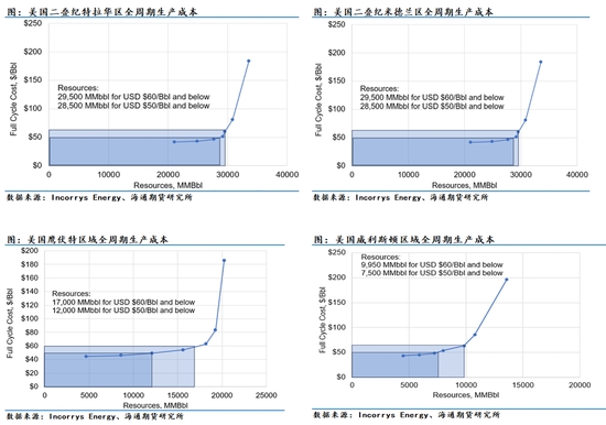 ②產(chǎn)區(qū)原油全周期成本。根據(jù)2024年末Incorrys Energy統(tǒng)計(jì)的數(shù)據(jù),其將二疊紀(jì)盆地劃分為(中央?yún)^(qū)、特拉華和米德蘭區(qū)域)。根據(jù)其統(tǒng)計(jì),在二疊紀(jì)中央?yún)^(qū),全周期成本在 50美元/桶價(jià)格下的石油資源量為3300百萬(wàn)桶,60美元/桶價(jià)格區(qū)間下可達(dá)3550百萬(wàn)桶;在特拉華區(qū)域,在50美元/桶價(jià)格區(qū)間下的石油資源量為28,500百萬(wàn)桶,60美元/桶價(jià)格區(qū)間下可達(dá)29,500百萬(wàn)桶。在米德蘭區(qū)域,50 美元/桶價(jià)格水平下的石油資源量為20,500百萬(wàn)桶,在60美元/桶價(jià)格水平下可達(dá)24,000百萬(wàn)桶。