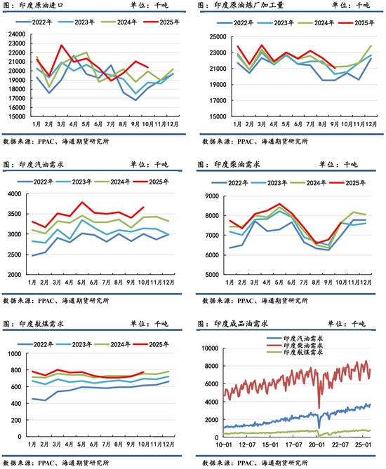 印度是全球第三大石油消費(fèi)國(guó)。從PP(7664, -18.00, -0.23%)AC公布的加工量和進(jìn)口量數(shù)據(jù)來(lái)看,年內(nèi)印度原油需求相對(duì)穩(wěn)定增長(zhǎng),成為亞洲地區(qū)原油需求增長(zhǎng)的重要引擎。2025 年1-9 月,印度煉廠加工量累計(jì)為2億噸,同比增速2%;累計(jì)進(jìn)口1.9億噸,同比增長(zhǎng)2%,占其需求量的90%以上。印度在本財(cái)年4-6月取得7.8%的 GDP 增速,創(chuàng)下 5 個(gè)季度以來(lái)最快水平。印度國(guó)內(nèi)經(jīng)濟(jì)的興起有利于推動(dòng)能源化工需求,而這從印度的汽柴煤需求指標(biāo)中也可以得到印證。2025年1-10月印度汽油需求平均為348.4萬(wàn)噸,同比+6.5%;柴油需求平均為764.6萬(wàn)噸,同比+2.3%;航煤需求平均為75.1萬(wàn)噸,同比+3.0%。