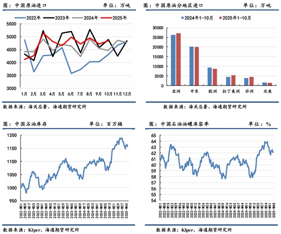今年以來(lái),受關(guān)稅政策、地緣沖突、產(chǎn)油國(guó)政策博弈、制裁風(fēng)波等因素影響,國(guó)內(nèi)原油囤積進(jìn)口的力度仍較強(qiáng),尤其是下半年的戰(zhàn)略儲(chǔ)備。海關(guān)數(shù)據(jù)顯示,2025年1-10月原油累計(jì)進(jìn)口量達(dá)到4.71億噸,較去年同期增長(zhǎng)3.05%,進(jìn)口來(lái)源依舊以中東為主,但進(jìn)口增量相較去年同期減少,其更多轉(zhuǎn)向亞太、南美、非洲進(jìn)口替代。同時(shí)受中美關(guān)稅爭(zhēng)端影響,1-10月自美國(guó)進(jìn)口量較去年同期減少73%,占比份額進(jìn)一步下降至0.5%以下。