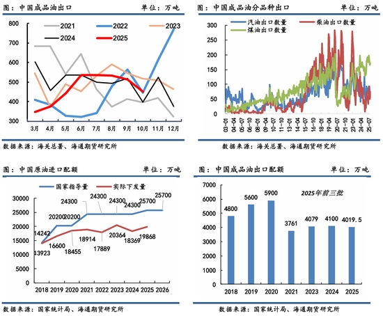 另外配額方面,近期國(guó)內(nèi)也下發(fā)了2026年的原油進(jìn)口配額,2026年指導(dǎo)下發(fā)量為2.57億噸,其中2026年第一批配額進(jìn)口總量773萬(wàn)噸,同比增加28%,將為后續(xù)原油進(jìn)口提供窗口。成品油出口配額方面,2025年前3批成品油出口配額下放至4019.5萬(wàn)噸,其中航煤在成品油出口配額中占比偏多。在海外汽柴裂解利潤(rùn)欠佳下,國(guó)內(nèi)汽柴油出口量低,煉廠出口轉(zhuǎn)內(nèi)銷更進(jìn)一步增加汽柴資源過(guò)剩。而航煤油出口上漲明顯,也僅只是給予的出口配額占比偏高,煉廠最大化利用出口配額。