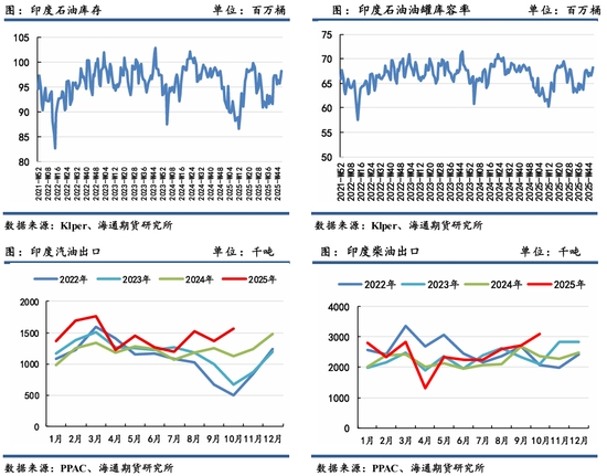 歐洲石油庫(kù)存在下半年出現(xiàn)反季節(jié)性增加,主要由于歐盟第18輪制裁擬于2026年1月全面升級(jí)對(duì)俄羅斯生產(chǎn)的燃料貿(mào)易限制,使得歐洲市場(chǎng)成品油供應(yīng)緊張,尤為是柴油市場(chǎng),這也在下半年期間歐洲柴油裂解價(jià)差出現(xiàn)大幅上漲跡象中可以得到體現(xiàn),也可在8月份印度對(duì)歐洲創(chuàng)紀(jì)錄出口柴油中得到驗(yàn)證。今年歐洲累積的石油庫(kù)存壓力大,也即柴油裂解利潤(rùn)可觀下,煉廠柴油生產(chǎn)積極性高,如若庫(kù)存增速快于需求增速,也將使得歐洲柴油緊張局勢(shì)緩和,進(jìn)而使得裂解差回落。