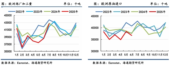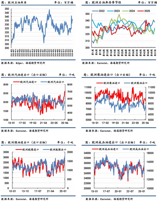據(jù)Eurostat 官方數(shù)據(jù)最新錄得2025年1-7月,歐洲煉廠原油加工量為2.73億噸,較去年同期2.82億噸回落3.2%;且上半年進(jìn)口量基本弱于去年,主要由于歐洲經(jīng)濟(jì)相對(duì)不景氣,煉廠檢修產(chǎn)能增加。另外,對(duì)于歐洲的成品油需求來(lái)看,整體汽柴煤總需求較去年改善明顯。前1-7個(gè)月,歐洲成品油需求為1.95億噸,較去年同期1.93億噸增長(zhǎng)1%。整體歐洲的需求仍主要由德國(guó)拉動(dòng),德國(guó)基礎(chǔ)設(shè)施支出有望延續(xù)地區(qū)經(jīng)濟(jì)增長(zhǎng)動(dòng)能,進(jìn)而推動(dòng)石油需求。