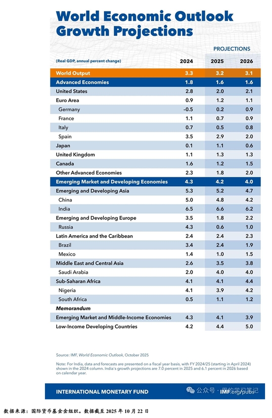 10 月14日,國(guó)際貨幣基金組織(IMF)在世行和IMF年會(huì)期間發(fā)布《世界經(jīng)濟(jì)展望報(bào)告》。與 7 月預(yù)測(cè)值相比,新一期報(bào)告對(duì)中國(guó)今年經(jīng)濟(jì)增速4.8%的預(yù)測(cè)維持不變。全球經(jīng)濟(jì)增速將從2024年 的3.3%放緩至2025年的3.2%,2026年將進(jìn)一步降至3.1%。其中,發(fā)達(dá)經(jīng)濟(jì)體的增速約為1.5%,新興市場(chǎng)與發(fā)展中經(jīng)濟(jì)體增速略高于4%。預(yù)計(jì)美國(guó)今明兩年經(jīng)濟(jì)增速分別為2%和2.1%,較7月預(yù)測(cè)值上調(diào)0.1個(gè)百分點(diǎn)。隨著世界各國(guó)適應(yīng)日益加劇的貿(mào)易保護(hù)主義和碎片化格局,中國(guó)的GDP預(yù)計(jì)在2025年增長(zhǎng)4.8%,2026年增長(zhǎng)4.2%,與4月份報(bào)告相比分別增加0.8和0.2個(gè)百分點(diǎn),凸顯了我國(guó)經(jīng)濟(jì)發(fā)展的巨大韌性和增長(zhǎng)潛力。報(bào)告稱,由于各方協(xié)議及政策調(diào)整,部分極端高關(guān)稅情況有所緩和,但整體環(huán)境仍不穩(wěn)。
