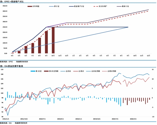 OPEC+在2025年4月起宣布開(kāi)始停止減產(chǎn)計(jì)劃,并著手恢復(fù)其在20年起自愿減產(chǎn)的原油產(chǎn)能,第一批預(yù)計(jì)實(shí)施恢復(fù)220萬(wàn)桶/日的原油產(chǎn)量,但在同年5至9月份,OPEC+就通過(guò)提速增產(chǎn)已完成了合計(jì) 232.6萬(wàn)桶/日的原油產(chǎn)量。隨著進(jìn)入10月,OPEC+宣布將會(huì)開(kāi)始實(shí)施第二部分資源減產(chǎn)恢復(fù)計(jì)劃,預(yù)計(jì)共恢復(fù)165萬(wàn)桶/日,在10月、11月、12月分別增產(chǎn)13.7萬(wàn)桶/日,雖然在明年一季度暫停增產(chǎn),但過(guò)高的總體增產(chǎn)計(jì)劃仍有較大的隱患,從而加大了市場(chǎng)對(duì)于供應(yīng)嚴(yán)重過(guò)剩的看空情緒。