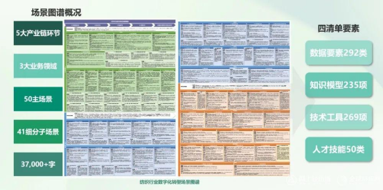 該圖譜全面覆蓋紡織產(chǎn)業(yè)鏈的研發(fā)設(shè)計(jì)、生產(chǎn)制造、經(jīng)營(yíng)管理三大業(yè)務(wù)領(lǐng)域,系統(tǒng)梳理出50個(gè)主場(chǎng)景和41個(gè)細(xì)分場(chǎng)景,每個(gè)場(chǎng)景均包含現(xiàn)狀評(píng)級(jí)、數(shù)據(jù)要素、知識(shí)模型、技術(shù)工具、人才技能及痛點(diǎn)問(wèn)題關(guān)鍵要素,為行業(yè)制定標(biāo)準(zhǔn)和推進(jìn)應(yīng)用落地提供了權(quán)威的理論基礎(chǔ)和方法,使紡織服裝企業(yè)的數(shù)字化轉(zhuǎn)型之路更清晰、更高效。