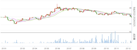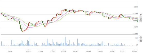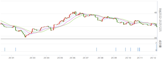 今日(周二)生絲盤(pán)面跌勢(shì)進(jìn)一步擴(kuò)散,各遠(yuǎn)近合約價(jià)格延續(xù)下行態(tài)勢(shì)。近月至中期合約(20251225-20260925)集體收于46 萬(wàn)元關(guān)鍵關(guān)口下方,而遠(yuǎn)期合約(261025 及以后)則進(jìn)一步下探至46.2萬(wàn)元的水平,技術(shù)面下跌趨勢(shì)持續(xù)有所強(qiáng)化。