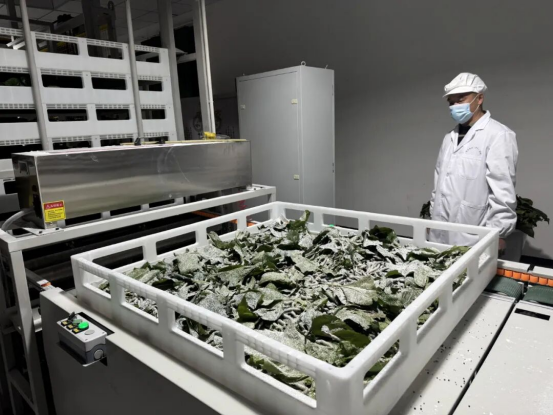 到了吐絲結(jié)繭的關(guān)鍵期,盡管熟蠶的食欲會(huì)下降,但每天三頓的喂食還是不能馬虎。李叢興操作起設(shè)備,其他工人只需配合將蠶盤和桑葉放進(jìn)設(shè)備入口端,設(shè)置好參數(shù),傳輸帶便將定量的桑葉均勻地鋪放在蠶盤上,還會(huì)進(jìn)行撒石灰粉等消毒程序?!懊刻扉g隔8小時(shí)喂食一次,此外,兩到三天還要除一次沙?!睆垙娜榻B,除沙就是給蠶“打掃房間”,把糞便、殘葉等清理出去。