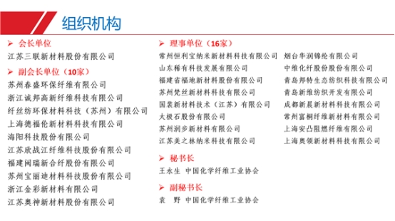 會(huì)上,中國(guó)化纖協(xié)會(huì)高性能和高功能纖維分會(huì)形成了新一屆組織機(jī)構(gòu)。其中,江蘇三聯(lián)新材料股份有限公司擔(dān)任分會(huì)會(huì)長(zhǎng)單位,蘇州春盛環(huán)保纖維有限公司等10家企業(yè)擔(dān)任副會(huì)長(zhǎng)單位,中國(guó)化纖協(xié)會(huì)市場(chǎng)推廣部主任王永生擔(dān)任秘書(shū)長(zhǎng),中國(guó)化纖協(xié)會(huì)袁野擔(dān)任副秘書(shū)長(zhǎng)。